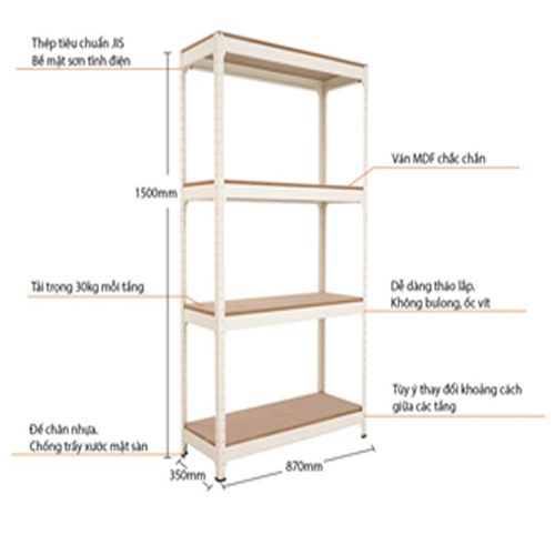 ♦Bửng ván MDF chắc chắn với tải trọng chịu lực 120 kg (30kg mỗi tầng). Khoảng cách giữa các tầng có thể điều chỉnh tùy ý.